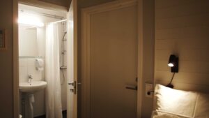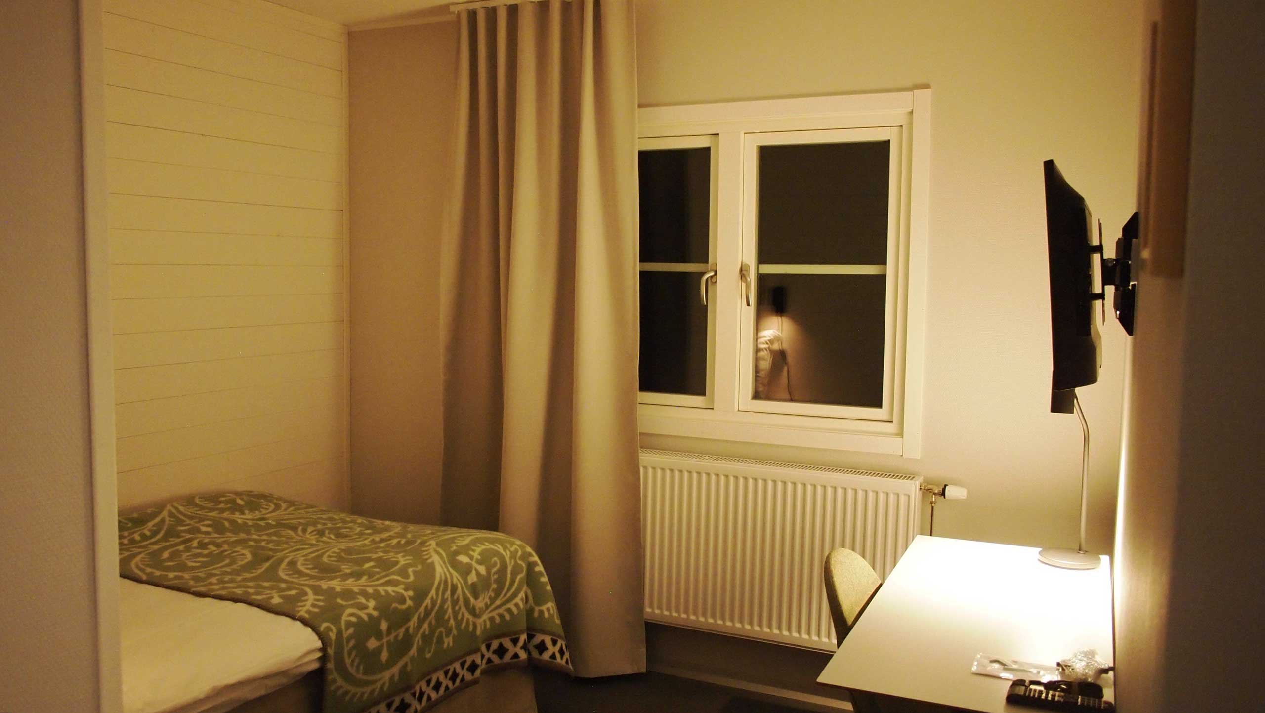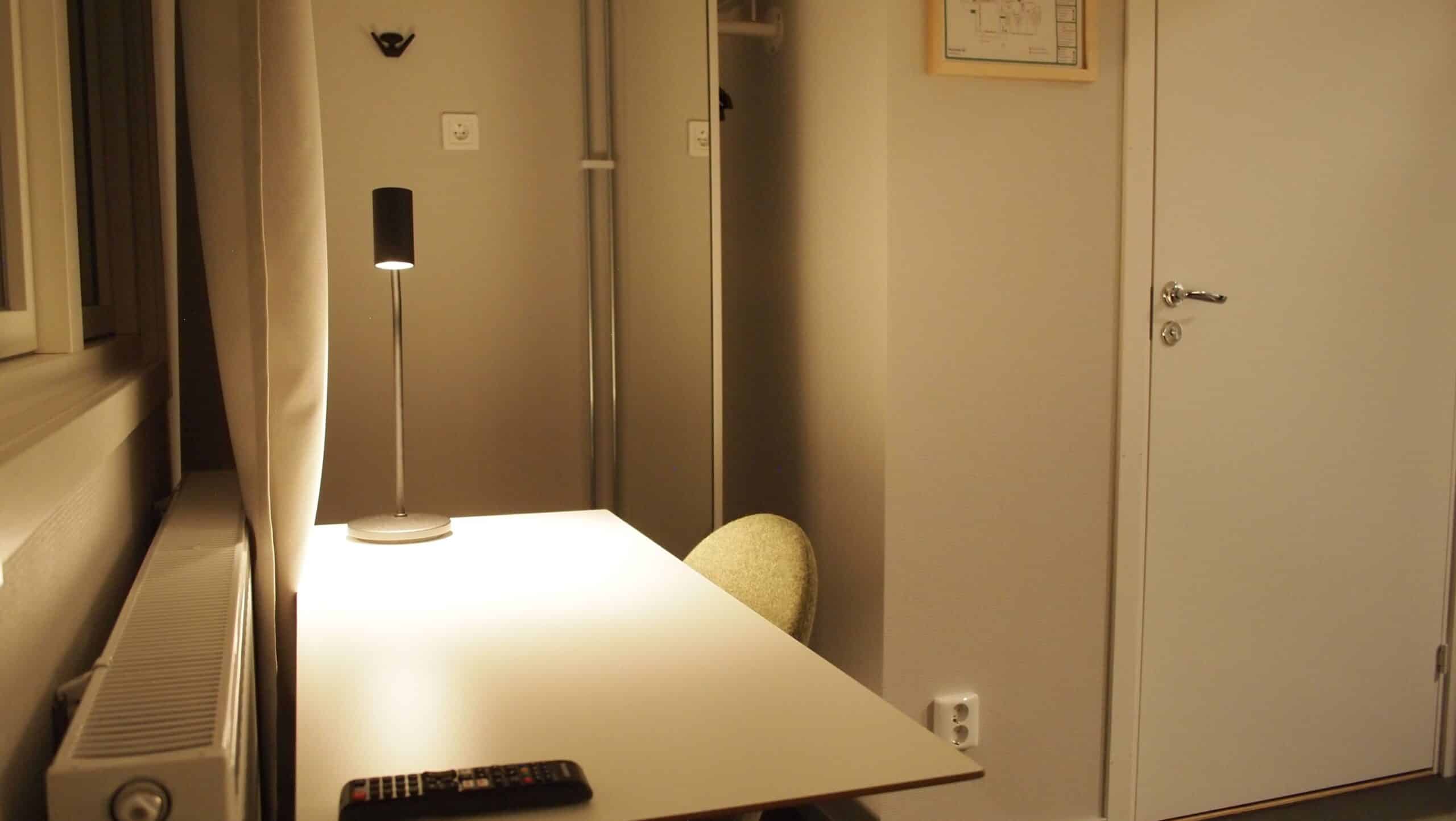 – 120 cm säng – Badrum med toalett, dusch, handfat och handdukstork – Skrivbord och stol – Avlastningsmöbel – Helkroppsspegel – Klädhängare – TV med baskanaler